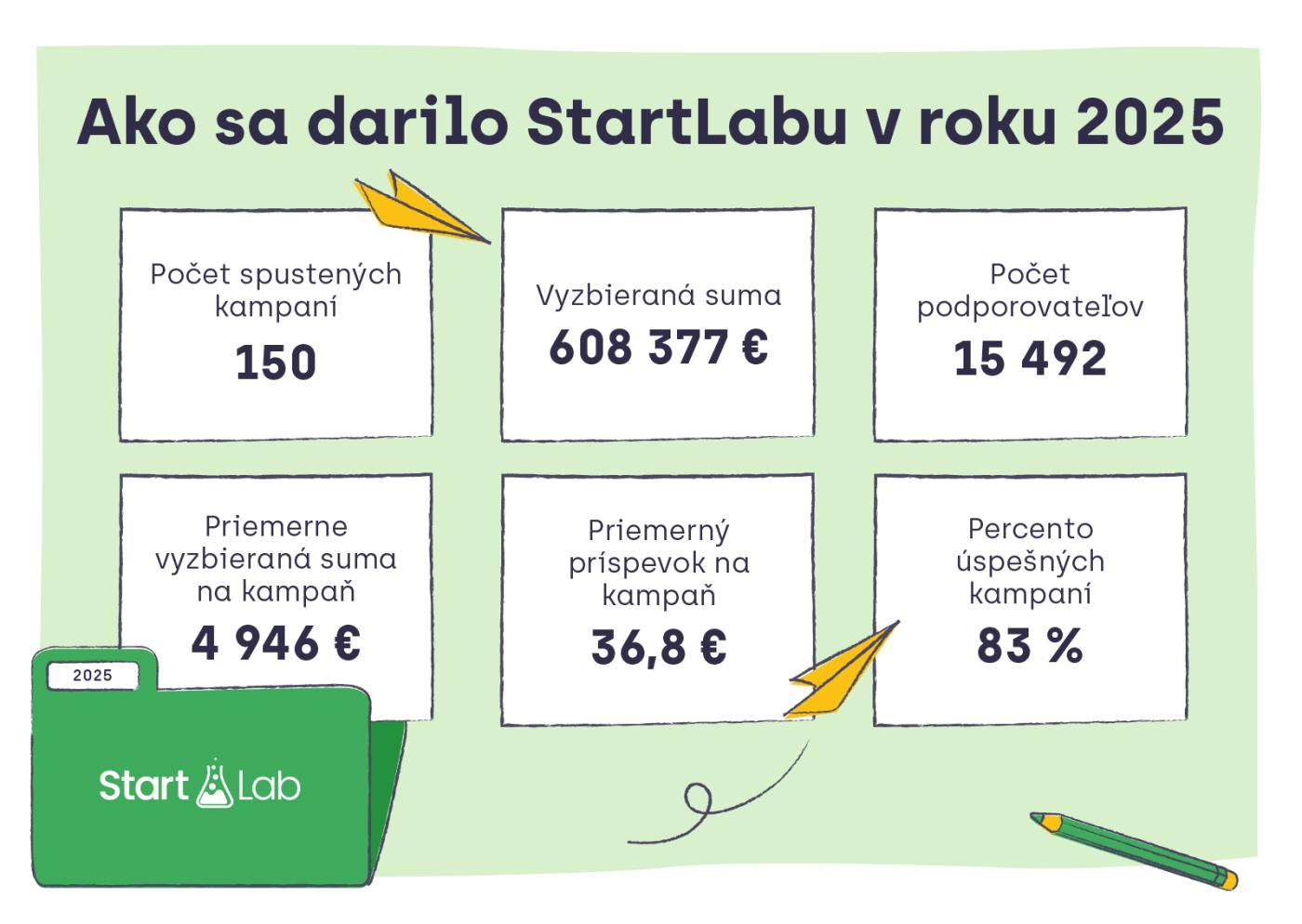 Autori a autorky u nás spustili 150 kampaní. V roku 2025 celkom 15 492 podporovateľov a podporovateliek prispelo 608 377 € na dobré nápady. Až 83 % kampaní dosiahlo svoj cieľ – najvyššia úspešnosť v histórii StartLabu.