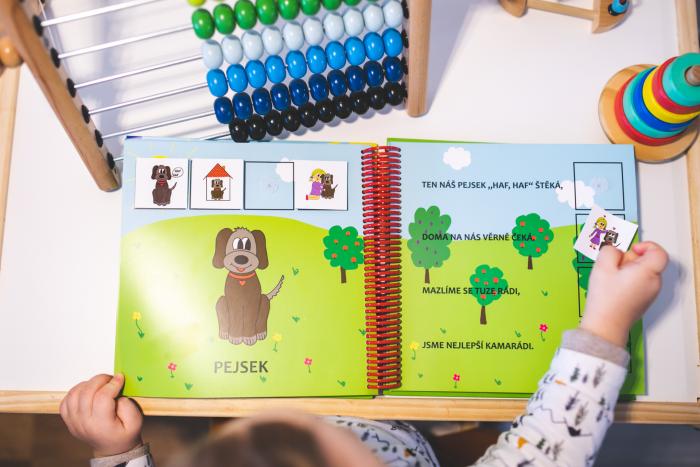 - Obsahuje pohyblivé kartičky, ktoré sú k stranám pripevnené suchým zipsom. Z knihy tak vytvárajú zábavnú hru, ktorá navyše rozvíja jemnú motoriku a pomáha pri rozvoji reči.