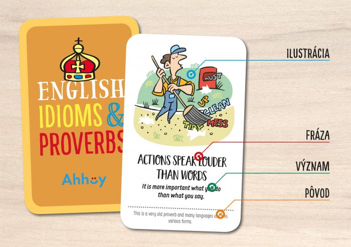 Obsahom balíčka je 36 kariet s anglickými frázami. Každá jedna je doplnená vtipnou ilustráciou, objasnením významu aj pôvodu, ako vznikla. Všetko je v anglickom jazyku.