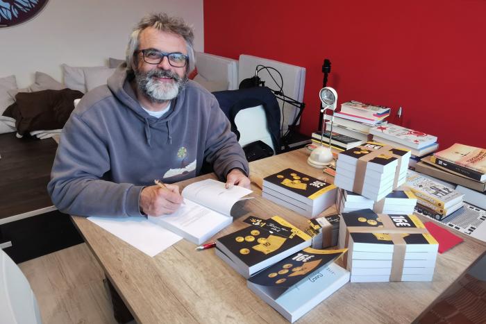 A tu môžete vidieť Vlasta, ako horlivo píše venovania do nových voňavých knižiek.