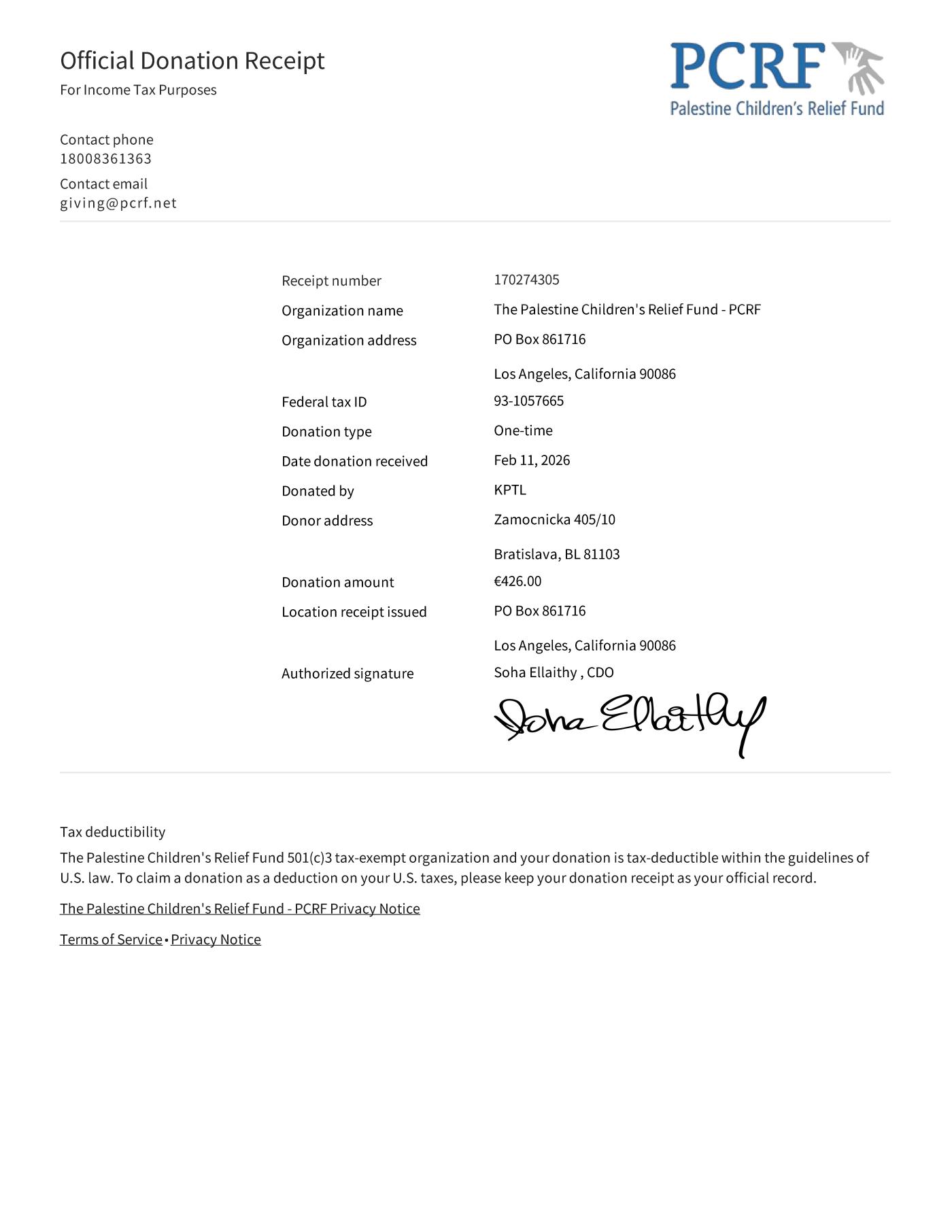 Z vašich príspevkov v podporovateľskej kampani sa podarilo vyzbierať sumu 1241,00 € pre organizáciu Palestine Children’s Relief Fund, ktorú sme v plnej výške odoslali 29. apríla 2025.