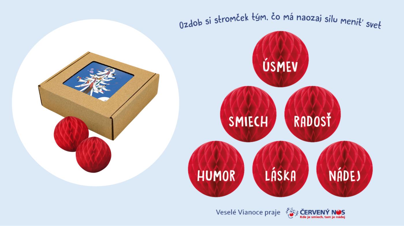 Vianočná krabička obsahuje 6 červených papierových gulí. Každá z nich symbolizuje hodnoty, ktoré sú v našich životoch veľmi dôležité - úsmev, smiech, radosť, lásku, nádej a humor. Vyzdobte si stromček tým, čo má naozaj silu meniť svet - svet chorých detí v nemocniciach.