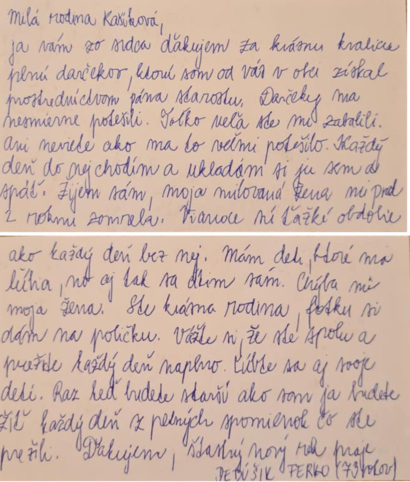 V Koľko Lásky o.z. vieme, že krabička je omnoho viac, než samotné veci v nej. Je to správa, že na človeku záleží. Dedúšik Ferko svojim darcom napísal, čo pre neho znamenala, a práve takýchto príbehov chceme priniesť čo najviac. Váš príspevok pomáha premeniť ticho na blízkosť a dávať cez nás priamo ľuďom, ktorí to potrebujú. Podporte našu zbierku a doprajete seniorom Vianoce, počas ktorých sa cítia videní, dôležití a milovaní.