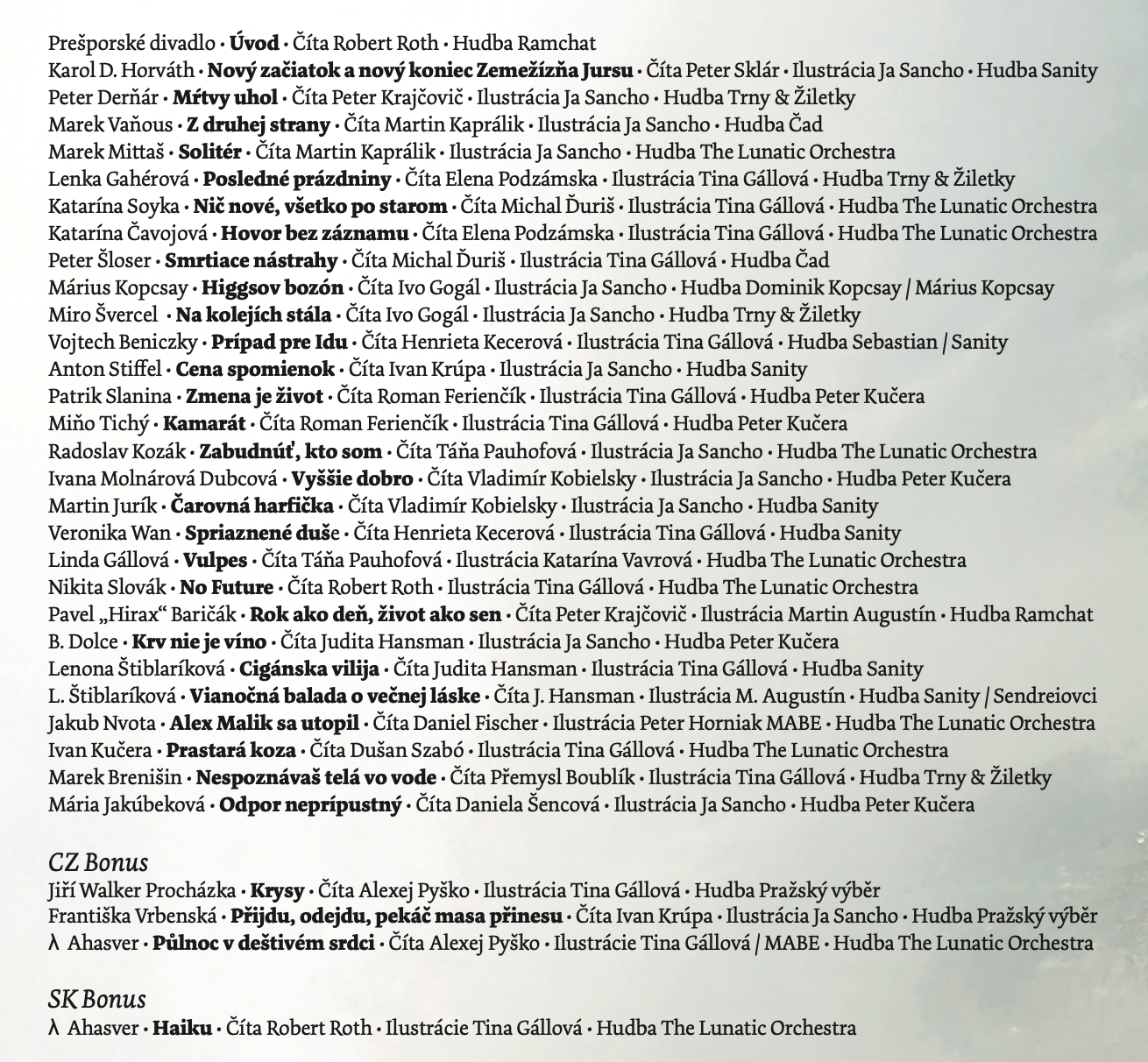 Množstvo tajomných poviedok od súčasných slovenských autorov a autoriek. Tešiť sa môžete aj na audioknihu, kde tieto poviedky narozprávali poprední slovenskí herci a herečky.